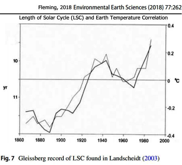 “Figure 7 is from Landscheidt (2003) where Gleissberg’s smoothed data were displayed. The heavy line is the smoothed LSC line and the light line is the land air temperature in the Northern Hemisphere. The heavy line agrees very well with the temperature and also with the temperature record […] with the cooling from 1940 to 1975. It appears that the atmospheric temperature is oblivious to CO2 concentration.”