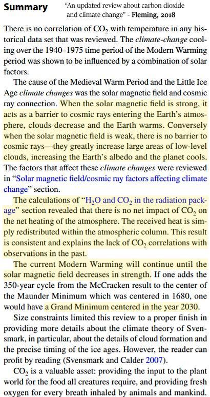 “The results of this review point to the extreme value of CO2 to all life forms, but no role of CO2 in any significant change of the Earth’s climate. … There is no correlation of CO2 with temperature in any historical data set that was reviewed. The climate-change cooling over the 1940–1975 time period of the Modern Warming period was shown to be influenced by a combination of solar factors. The cause of the Medieval Warm Period and the Little Ice Age climate changes was the solar magnetic field and cosmic ray connection. When the solar magnetic field is strong, it acts as a barrier to cosmic rays entering the Earth’s atmosphere, clouds decrease and the Earth warms. Conversely when the solar magnetic field is weak, there is no barrier to cosmic rays—they greatly increase large areas of low-level clouds, increasing the Earth’s albedo and the planet cools. The factors that affect these climate changes were reviewed in “Solar magnetic field/cosmic ray factors affecting climate change” section. The calculations of “H2O and CO2 in the radiation package” section revealed that there is no net impact of CO2 on the net heating of the atmosphere. The received heat is simply redistributed within the atmospheric column. This result is consistent and explains the lack of CO2 correlations with observations in the past. The current Modern Warming will continue until the solar magnetic field decreases in strength. If one adds the 350-year cycle from the McCracken result to the center of the Maunder Minimum which was centered in 1680, one would have a Grand Minimum centered in the year 2030.”