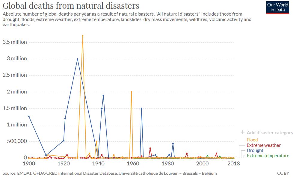 Die Wahrheit ist, dass entgegen den Ängsten von Greta und manchem Meinungsmacher seit den 1930er Jahren die Zahl der Menschen, die an klima- oder wetterbedingten Katastrophen (Fluten, Dürren, extreme Temperaturen und Unwetter) sterben, ständig zurückgegangen ist, wie die folgende Grafik zeigt (https://ourworldindata.org/natural-disasters). Die tödlichsten Überschwemmungen waren 1931 (bis zu 4 Millionen Tote), 1887 (bis zu 2 Millionen), 1938 (mehr als 500 Tausend), 1975 (229 000) und 1935 (145 000), aus https://de.qwe.wiki/wiki/List_of_deadliest_floods