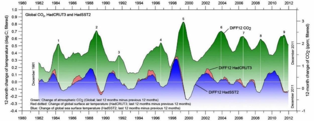 Die Grafik zeigt in grün die saisonbereinigten Änderungen des CO2-Gehalts der Atmosphäre von 1982 bis 2012. Die Kurve folgt den jährlichen Temperaturänderungen (blau) im Abstand von im Mittel 11 Monaten (https://www.researchgate.net/publication/257343053_The_phase_relation_between_atmospheric_carbon_di oxide_and_global_temperature, Humlum et al., 2013). Bei großen Temperaturänderungen dauert es entsprechend länger. Antarktis-Bohrkerne zeigen, dass am Ende der letzten Eiszeit der Temperaturanstieg 150 bis 200 Jahre vor dem Anstieg des Kohlendioxids erfolgte, das aus den erwärmten Ozeanen entwich, wie bei einer Flasche Cola, die in der Sonne steht (Pedro et al., 2012, https://cp.copernicus.org/articles/8/1213/2012/cp8-1213-2012.html).