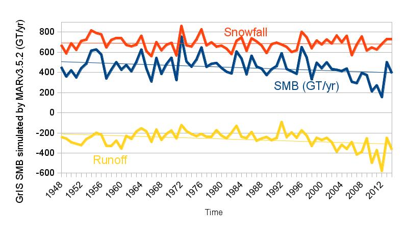 Die blaue Kurve (SMB = Surface Mass Balance) ist das Resultat aus Zuwachs durch Schneefälle (rot) und Eisverlust durch Schmelzen (Runoff, gelb). Der Zuwachs an Eis an der Oberfläche betrug in den letzten 20 Jahren im Mittel 400 GT pro Jahr. Für die Gesamtbilanz fehlt der Eisverlust durch das Kalben der Gletscher. Insgesamt verliert Grönlands Eiskappe seit dem Ende der kleinen Eiszeit jährlich im Mittel 100 GT an Masse (https://www.nature.com/articles/nature16183), verstärkt in den Jahren 1998 bis 2012 (s. Atlantische Multidekaden-Oszillation). Bei einer Rate von 100 GT pro Jahr würde es übrigens etwa 25 000 Jahre dauern, bis das Eis ganz geschmolzen ist. Das wird natürlich nicht passieren, weil vorher die nächste Eiszeit kommt.
