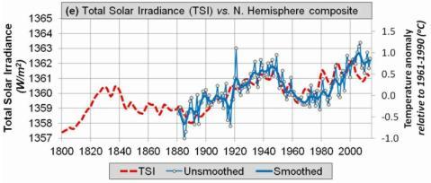 Der Mensch und seine Emissionen können auf anderen Planeten nicht die Ursache sein. Es ist die Sonne! Diese Grafik zeigt den Temperaturverlauf ländlicher Messstationen – die nicht vom Effekt der urbanen Hitzeinseln betroffen sind - der nördlichen Hemisphäre (blaue Kurve) und die Veränderung der Intensität der Sonnenstrahlung (rot, aus Soon et al., Earth Science Reviews, 2015, https://www.researchgate.net/publication/282389821_Reevaluating_the_role_of_solar_variability_on_Northern_Hemisphere_temperature_trends_since_the_19th_cent ury):