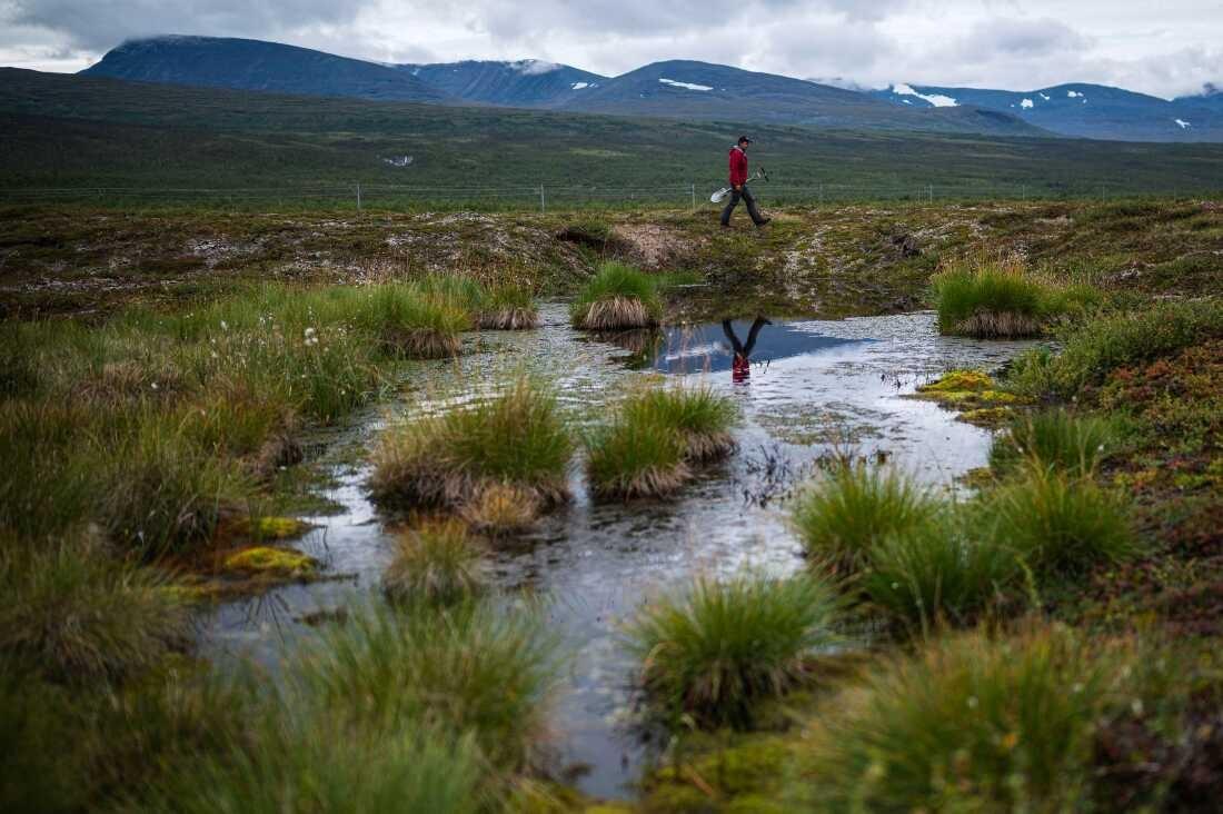 Scientist Keith Larson walks past a pond formed by thawing permafrost in Sweden.
