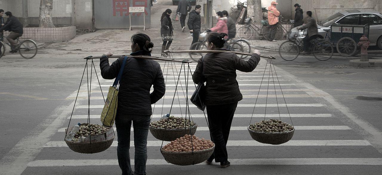 Two women are carrying baskets of fruits. Nanjing, China.Datum 29. Dezember 2007