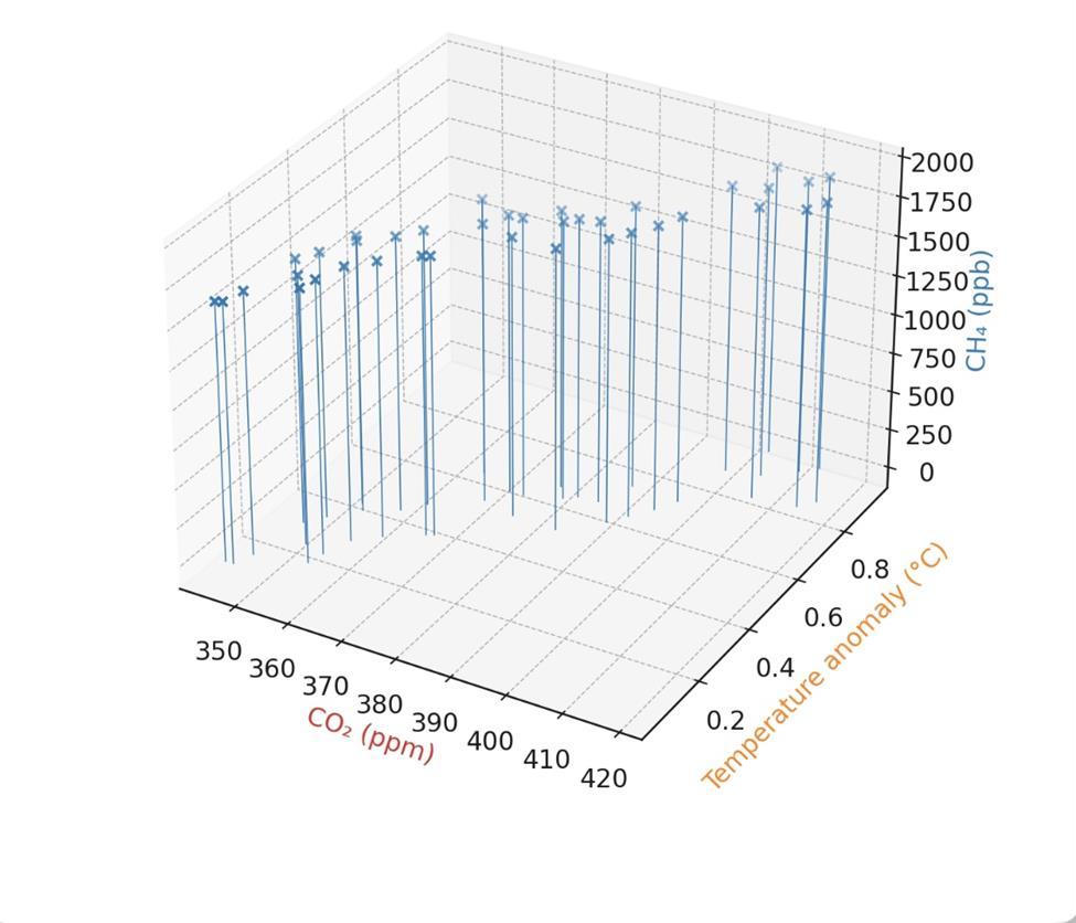 Figure 3.A3D scatterplot of CO2, temperature and CH4, for 1984 to 2022.