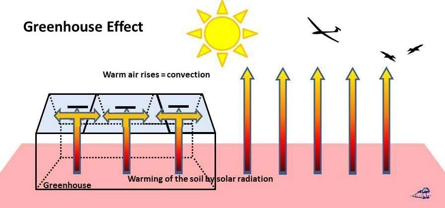 The sun heats the Earth's surface – and, of course, the floor of a greenhouse. However, the glass roof of this greenhouse simply prevents heat from escaping due to the rising of light-weighted warm air, and therefore it is warmer inside the glasshouse than in its surroundings. In the wild, this rising of warm and therefore lighter air helps birds of prey and gliders cover long distances without effort or propulsion. Convection is therefore a gravity-driven transport of matter and has nothing to do with radiation. Physically, the greenhouse effect does not generate additional heat, but merely prevents the dissipation of heat already been generated.