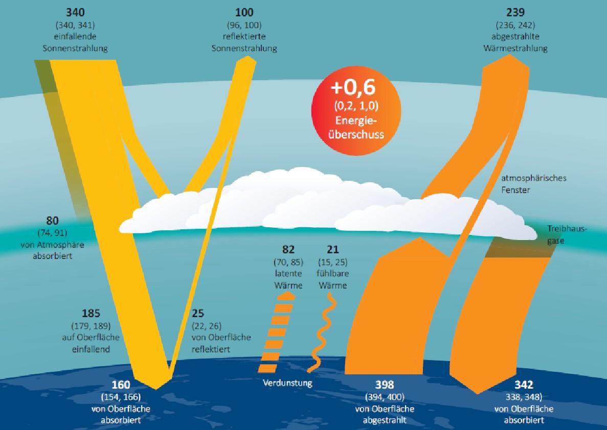 ● The human-induced greenhouse effect changes the energy balance of the Earth and has led to an excess energy flow of 0.6 Watts/m².