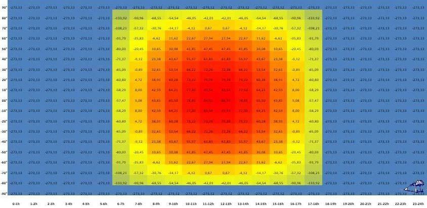 This and the following figure are color-coded Excel tables. The geographic latitude from 90°N to 90°S is plotted on the left, and the hourly intervals of the 24-hour day, which represent a flat 360° projection of the Earth, are plotted horizontally. Average values for the hour intervals are given as half-hour values.