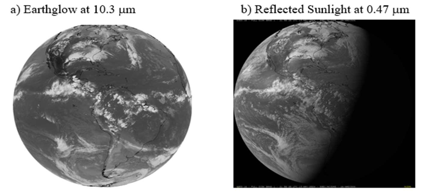 Figure 8: Satellite images retrieved at 6:12 pm EST on May 13, 2024 [10] of a) Earth-glow measured at 10.3 m and b) reflected sunlight measured at 0.47 m.