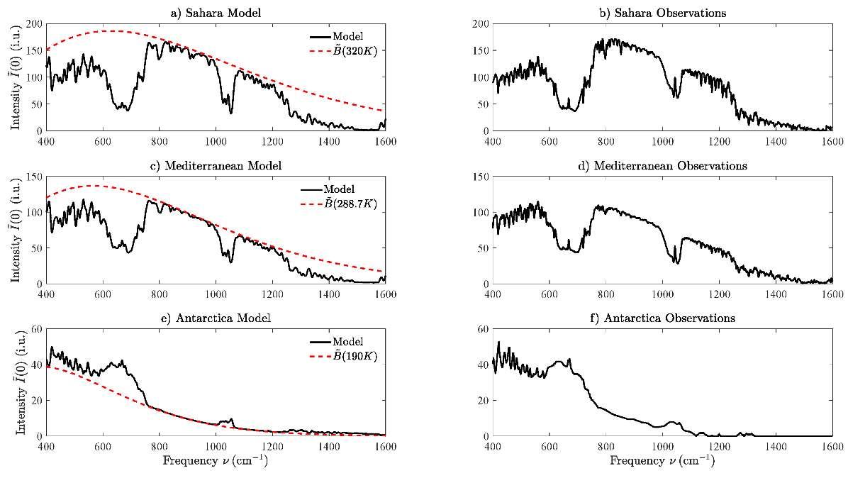 Figure 9: Comparison of modeled for a clear sky with data observed by a Michaelson interferometer in a satellite over the Saharan desert, the Mediterranean and Antarctica [11]. The intensity unit is 1 i.u. = 1 mW m-2 cm sr-1. Radiative forcing is negative over wintertime Antarctica since the relatively warm greenhouse gases in the troposphere, mostly CO2, O3 and H2O radiate more to space than the cold ice surface at a temperature of T = 190 K, could radiate through a transparent atmosphere.