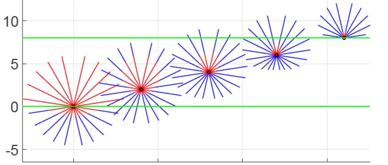 Figure 13: Scattering in an isothermal cloud. The green lines show the bottom and top of a cloud layer at optical depths = 0 and = 8. The blue rays show intensities thermally generated by isothermal cloud particulates with a Planck Intensity B. The red rays show incident and scattered intensities from a black body located below the cloud. The black body is warmer than the cloud and has a 20% larger Planck intensity.