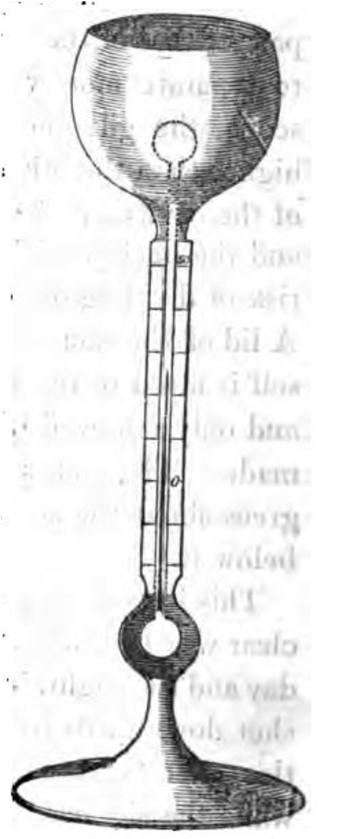 An aethrioscope consists of two spherical glass bulbs, connected by a capillary tube containing a short column of alcohol (liquor) in the midsection. The lower bulb is shielded from radiation and held at room temperature. The upper bulb is at the focus of a parabolic reflector, a polished metal cup, which lets downward radiation focus on the bulbandheatit.Viceversa,thermal radiationemittedfrom the bulb is projected into the sky above. The cup plays much the same role as the dish antenna of a modern radar. The colder the apparent sky temperature, the higher the column of liquor is forced upward toward the absorbingemitting bulb.