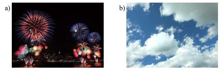 Figure 12: The left figure (a) shows thermal emission, i.e. visible light emitted by very hot atoms or particulates, in this example by fireworks, but also by lightning, aurora etc. Long wave infrared radiation is emitted by greenhouse gas molecules and particulates at normal atmospheric temperatures. The right figure (b) shows scattered white sunlight from particulates of water or ice (clouds), and blue, Rayleigh-scattered sunlight from N2 and O2 in cloud-free air. Scattered long wave infrared radiation comes onlyfromparticulates,forexample,thewateroriceparticulatesofclouds. Thereisnegligiblescattering of long wave radiation by molecules.