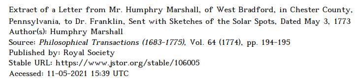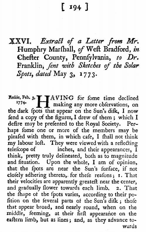 I have sent thee my observations for twelve month and a few Days that I have made in the Sun’s Disk respecting the Spots that appear thereon, having Drew a circle With a pencil to represent the Suns Circumferrence and then with my Pencil Dilineated the Spots both in Magnitude and Position as near the truth as I Could as they Pas’d, in appearance from East to West. I have not time to Give thee my thoughts respecting them at present. (Humphry Marshall to Ben Franklin, November 27, 1771)