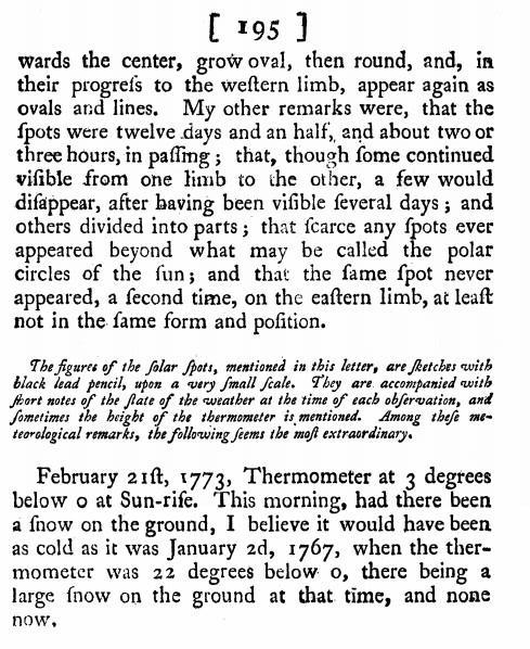 It is however remarkable that tho’ large Spots are seen gradually to become small ones, no one has observ’d a small Spot gradually to become a large one; at least I do not remember to have met with such an Observation. If this be so, it should seem that they are suddenly form’d of the full Size: And
