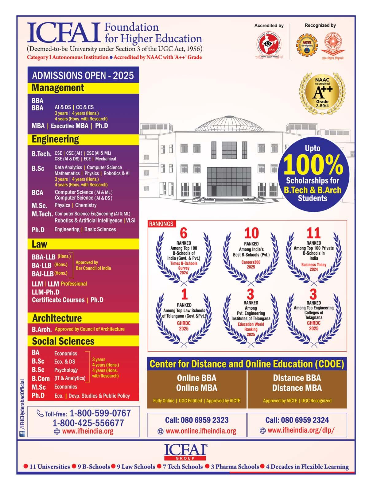 IN THE VIBRANT HEART OF HYDERABAD STANDS THE ICFAI FOUNDATION FOR HIGHER EDUCATION (IFHE), A DEEMED-TO-BE-UNIVERSITY THAT IS REDEFINING THE CONTOURS OF MODERN HIGHER EDUCATION IN INDIA. RECOGNIZED BY THE UNIVERSITY GRANTS COMMISSION (UGC) AS A CATEGORY-I INSTITUTION AND ACCREDITED WITH AN A++ GRADE BY NAAC, IFHE HAS EMERGED AS A POWERHOUSE OF INNOVATION, ACADEMIC EXCELLENCE, AND INDUSTRY-READY EDUCATION. WITH A SPECTRUM OF CONSTITUENT SCHOOLS, INCLUDING THE RENOWNED ICFAI BUSINESS SCHOOL (IBS), ICFAITECH, ICFAI LAW SCHOOL, ICFAI SCHOOL OF ARCHITECTURE (ISARCH), AND THE ICFAI SCHOOL OF SOCIAL SCIENCES (ISOSS), THE UNIVERSITY IS SCULPTING FUTURE-READY PROFESSIONALS WHO ARE GLOBALLY COMPETENT AND SOCIALLY CONSCIOUS.