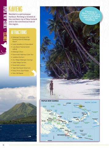 attractions • Malangan Carvings at the Kavieng Hotel & Malangan Resort • Local Jewellery on Nusa Island • Luka Barok Festival (shark calling) • Malangan Show • Buluminski Highway Cycle Tour • Laraibina Eel farm • Utu Village Malangan Carvings • Libba Village Carvers • Panamafei Lookout • Tigak Sea Kayak Adventure • Bulau Picnic Spot-Fissoa • Palm Hill Rapids
