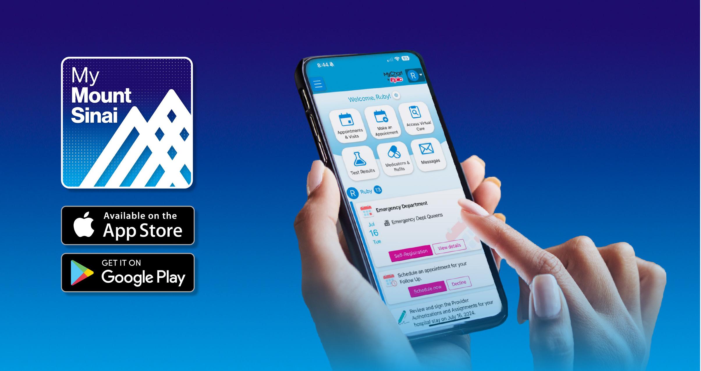 MyMountSinai 移动应用程序可免费下载和使用。您可直接在 Apple App Store 或 Google Play 下载。下载后,您可以用您的 MyChart 用户名和密码登录。如果您是 新患者,可以注册一个账户。