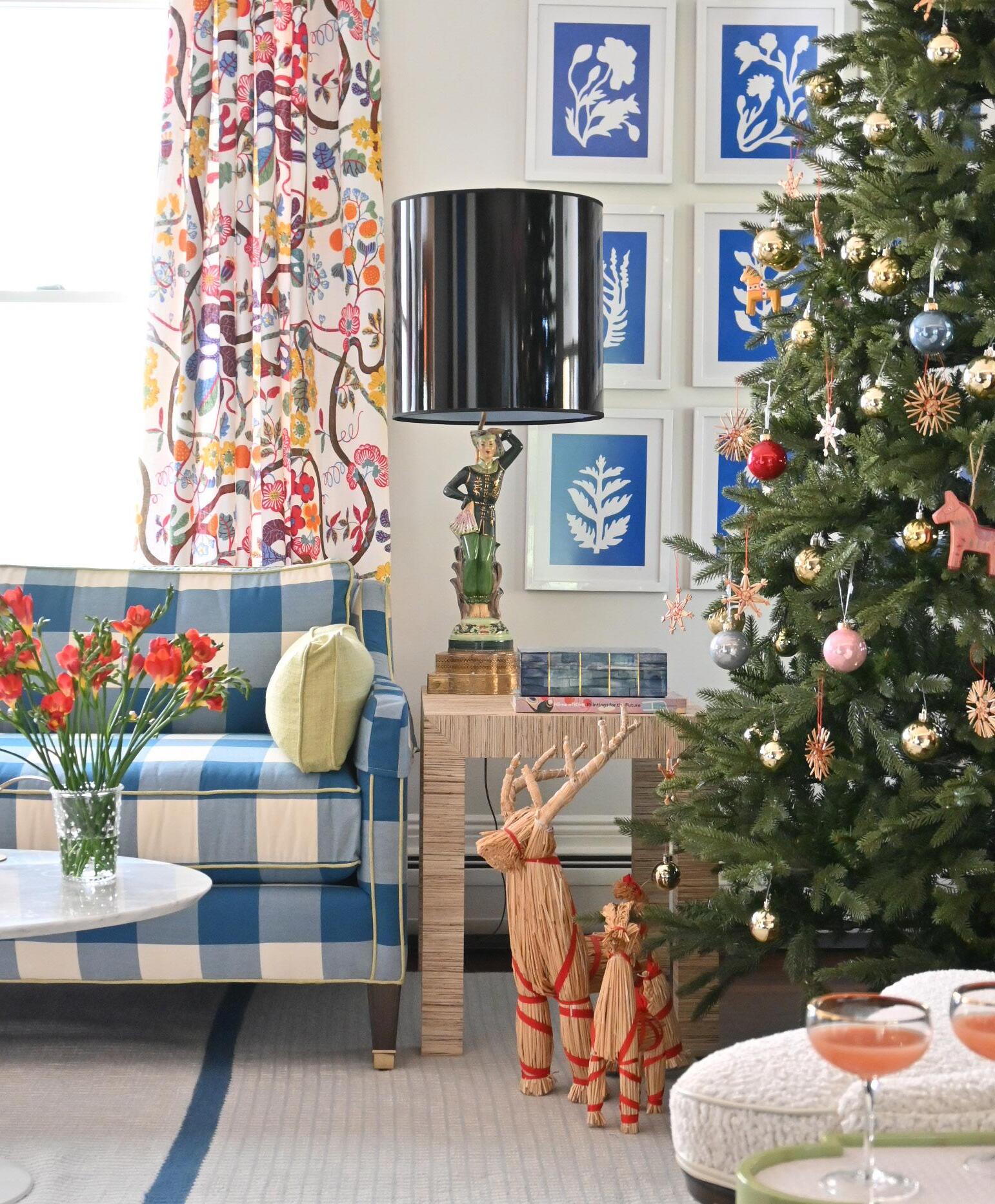 The fabric on the host and hostess chairs is from Schumacher, while the reupholstered cane chairs from Restoration Hardware feature Thibaut's Ashbourne Tweed, which is stain resistant. “We love that fabric for families with kids and pets,” says Elliott.