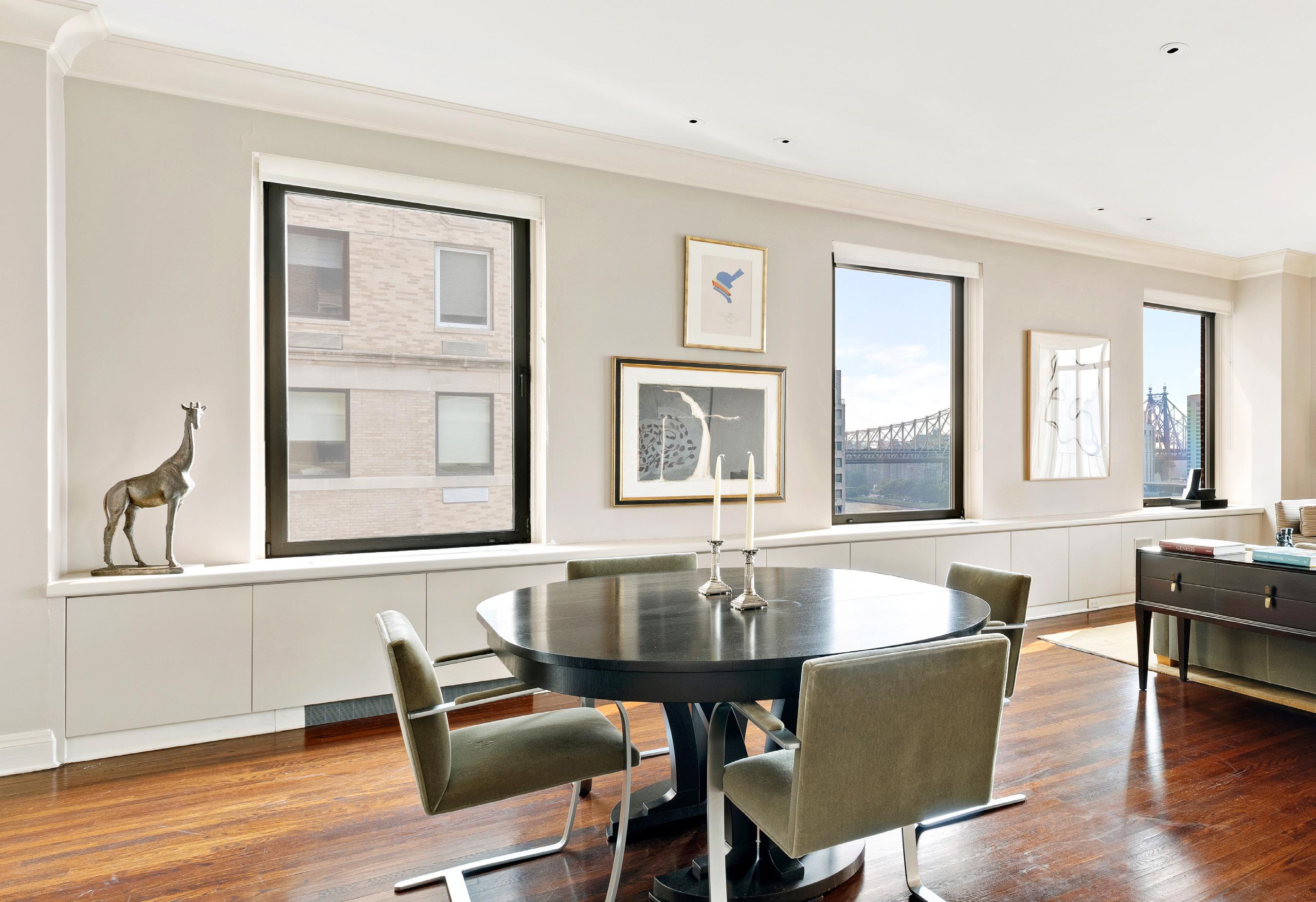 In this dining room, Designer Tracy Morris added a rug by Matt Camron Rugs featuring tones of lavender, cream, gray, and white to allow the darker tones in the table, sideboard, and floor to really pop. “I love the rug in the space because it complements the high-contrast elements in the room,” Morris says.