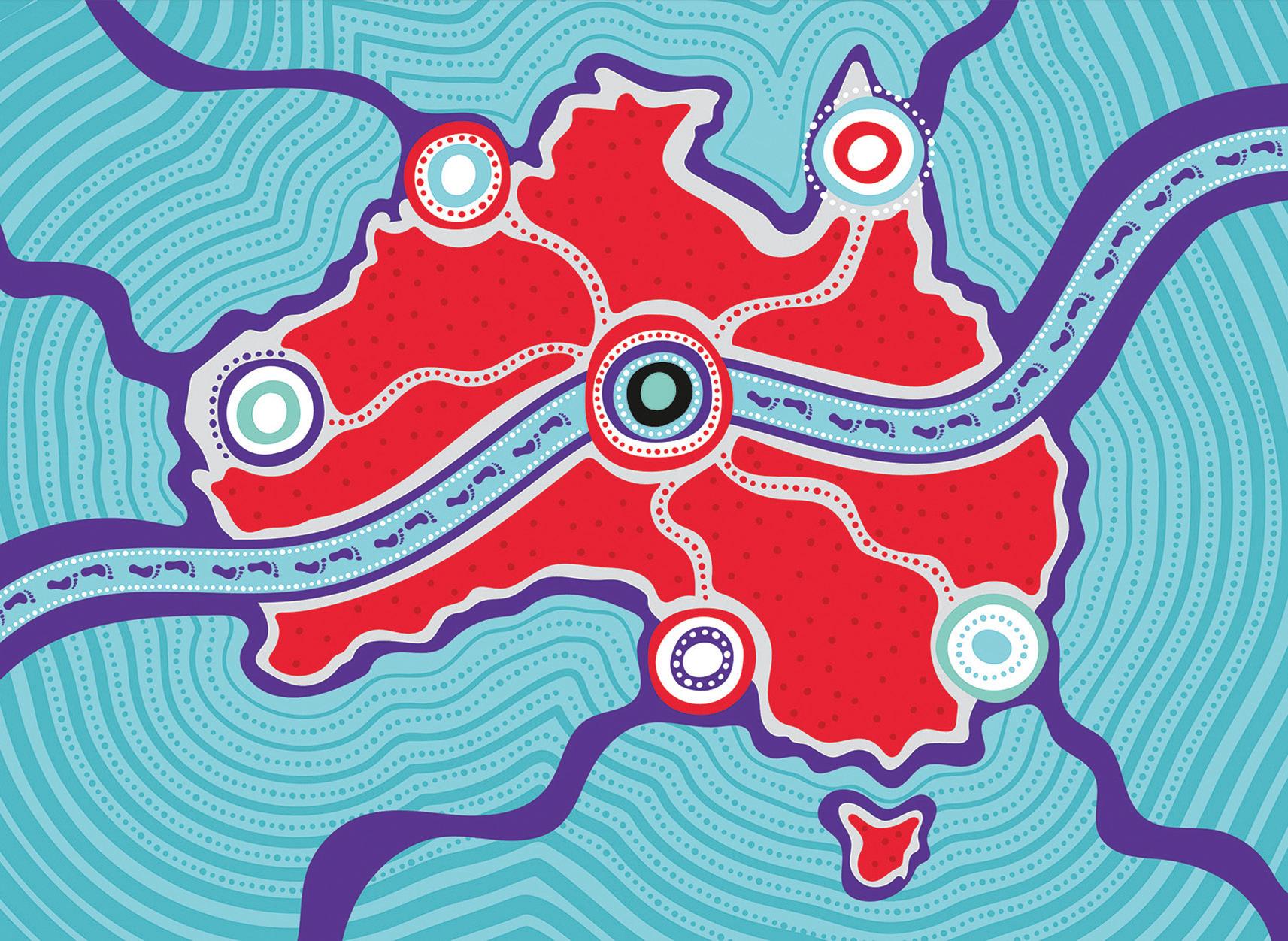 The artwork by Jordan Lovegrove, Ngarrindjeri, of Dreamtime Creative, shows John Holland driving positive change throughout Indigenous Australia. John Holland, represented by the large central meeting place, is reaching out to different communities to build relationships in an effort to empower and transform lives, shown by the pathways leading out to the other meeting places. The pathways with the footprints show John Holland’s journey from where we began looking towards the future.