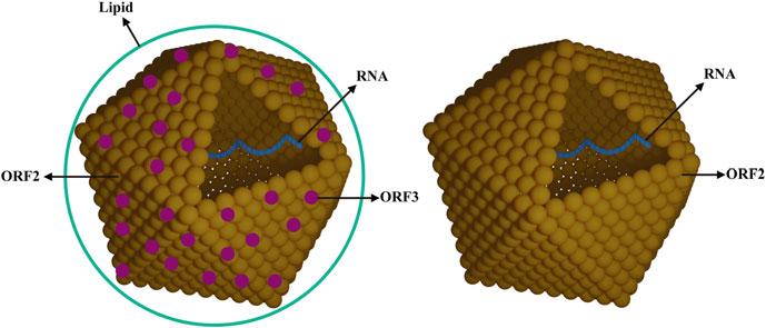 cell culture have a lipid envelope and either lack or have a little ORF3, whereas the viruses isolated from feces lack a lipid envelope but have ORF3 on their surfaces. Surprisingly, most of the secreted ORF2 proteins from both these sources are not associated with HEV RNA.