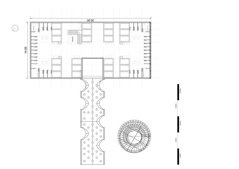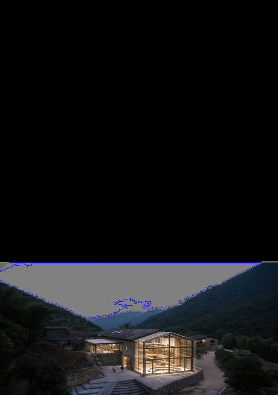 C a p s u e H o t e a n d B o o k s t o r e i n V i l l a g e Q n g l o n g w u i s l o c a t e d i n t h e d e e p f o r e s t s o f T o n g l u i n Z h e j i a n g p r o v i n c e I t w a s a n o l d h o u s e o f w o o d s t r u c t u r e a n d m u d w a l s c o v e r i n g a n a r e a o f 2 3 2 s q m a n d 7 . 2 m e t e r s . A t e l i e r t a o + c r e d e s i g n e d a n d r e g e n e r a t e d t h i s a n c i e n t b u i l d i n g b y i n s e r t i n g a c a p s u l e h o t e l t h a t c a n a c c o m m o d a t e 2 0 p e o p e T w o n d e p e n d e n t " f l o a t i n g " s t r u c t u r e s h a v e b e e n p l a c e d o n t o p o f e a c h o t h e r t o c r e a t e s e p a r a t e a c c o m m o d a t i o n a r e a s f o r m a l e a n d f e m a l e g u e s t s E a c h o f t h e c a p s u l e s h a s t e n c a p s u e r o o m s a n d o n e b a t h r o o m , h i d d e n a n d e n c l o s e d b y b o o k s h e l v e s . T h e s t a g g e r i n g f l o o r s l a b s f o r m e d a f e w " d o u b l e - h e i g h t " s p a c e s i n t h e a c c o m m o d a t i o n a r e a s A t t w i l g h t , t h e w h o l e b u i d i n g i s i l u m i n a t e d b y t h e l i g h t f r o m n d o o r s , a n d t h e b u i d n g i t s e l f b e c o m e s a l i g h t h o u s e T h e a r c h i t e c t c u t t h e w h o l e g a b l e w a l l o n t h i s s i d e o f t h e b u i d n g a n d e m b e d d e d a t r a n s p a r e n t s t r u c t u r e o f w o o d e n f r a m e s a n d c o r r u g a t e d p o l y c a r b o n a t e p a n e l s . T a o + C 2 0 1 9