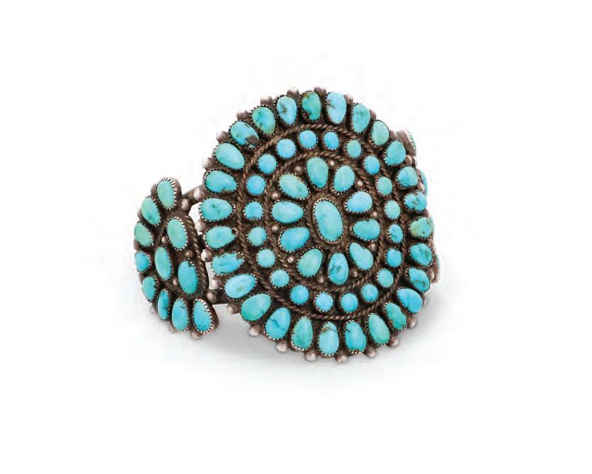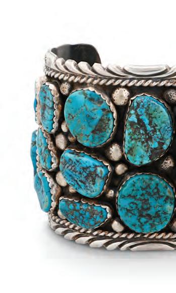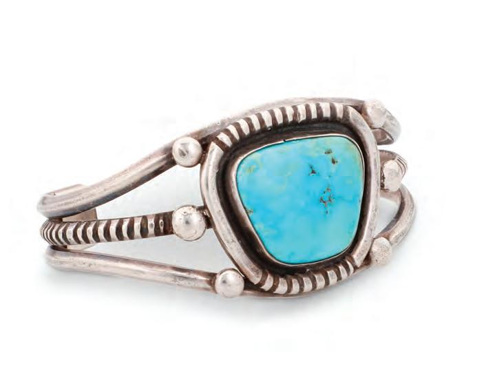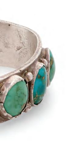 A chunky cuff with five row-set turquoise stones and elaborate stamped terminals