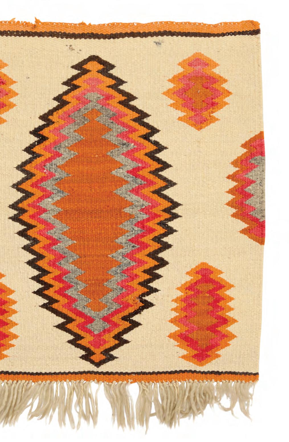 Woven in red, cream, orange, pink, and dark brown wool, with stacked serrated diamonds