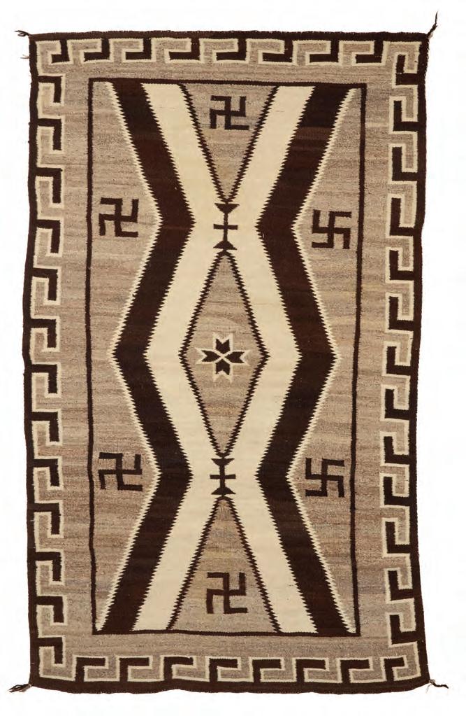 A Navajo regional rug Early 20th century, Diné Woven in cream, grey, and dark brown wool, with stacked diamonds and floating whirling log motifs within a hooked border
