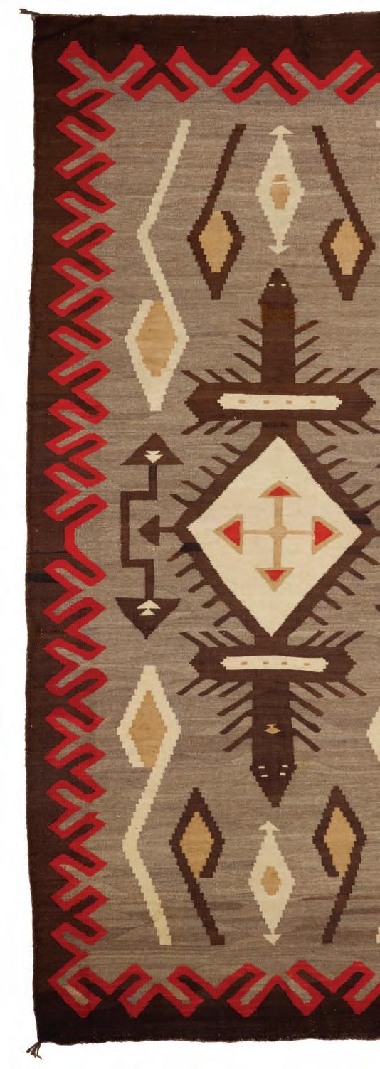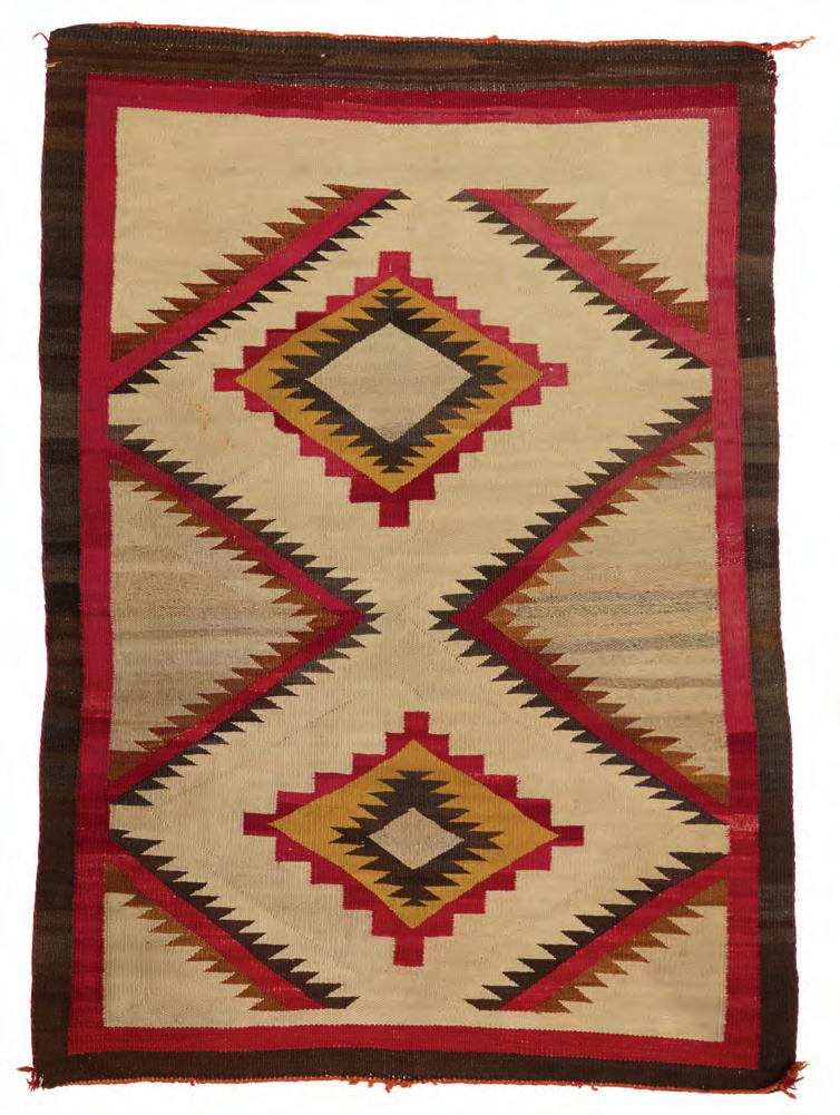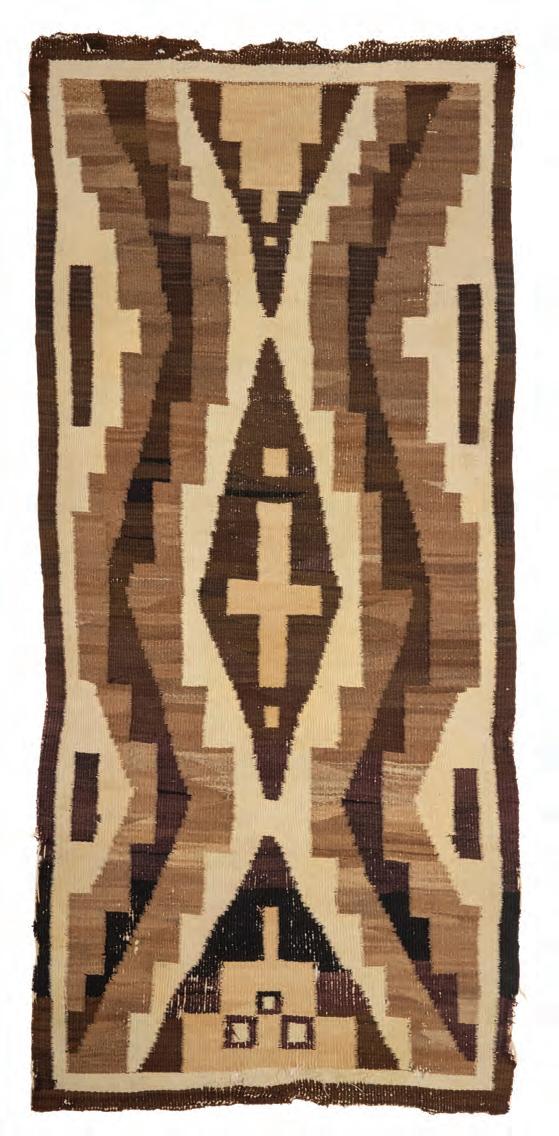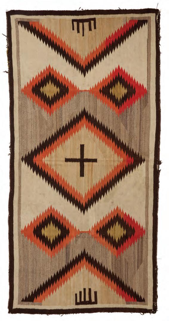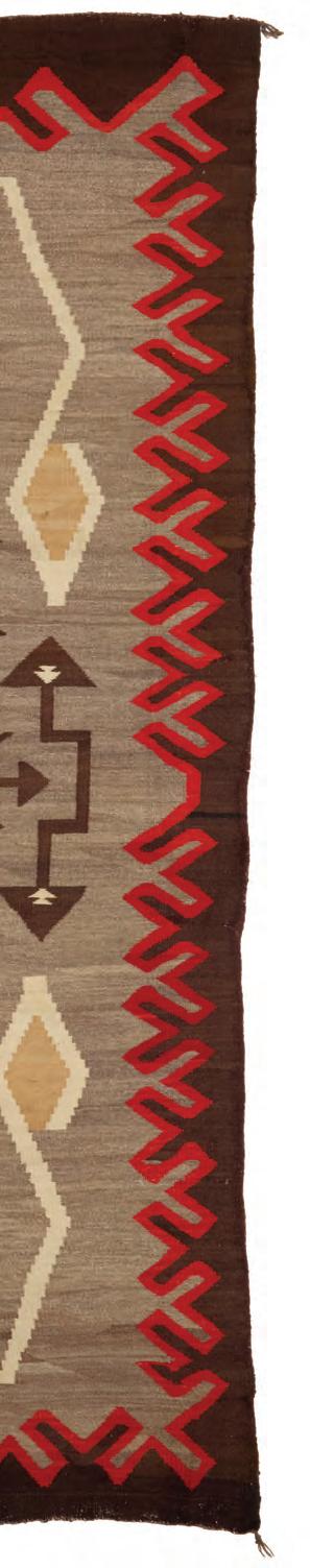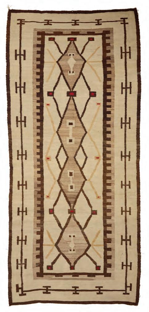 Woven in cream, natural brown, ochre, red, and dark brown wool, with central stacked diamonds within a denticulated inner border 110” H x 49” W