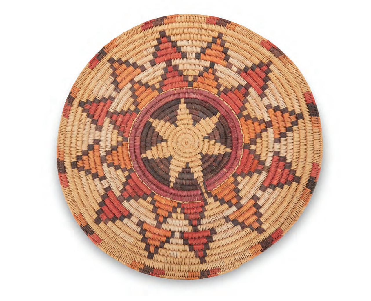 A Navajo Transitional textile Late 19th/early 20th century, Diné Woven in cream, orange, red, brown, and grey wool with a radiating central diamond and alpaca/goat fringe 20” H x 20” W; Fringe: 3”