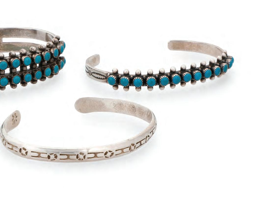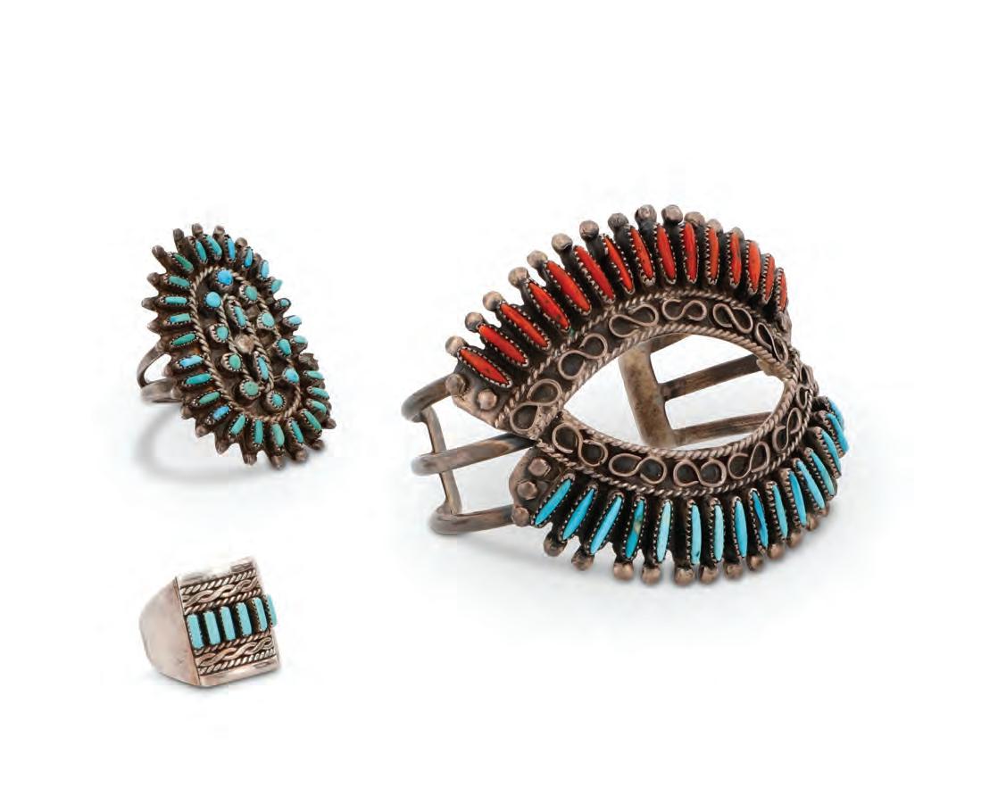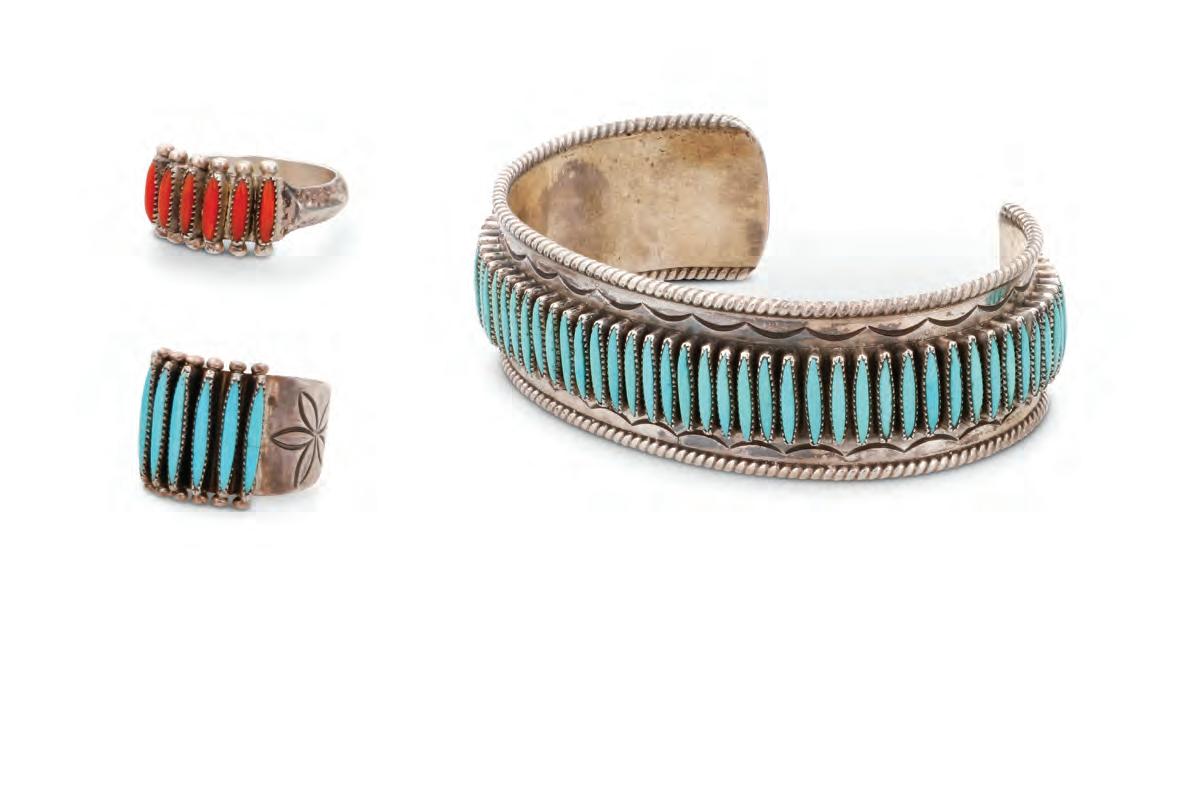 The cuff and each ring with a band of fine row-set needlepoint turquoise or coral and stamped motifs to edges