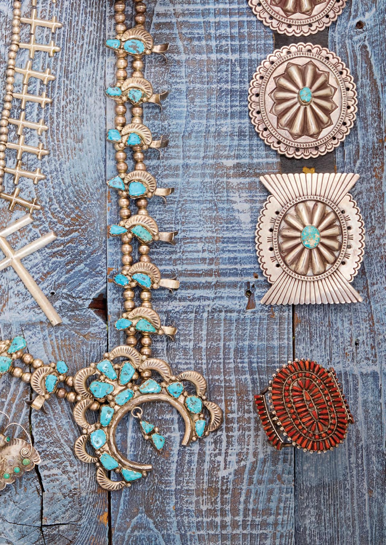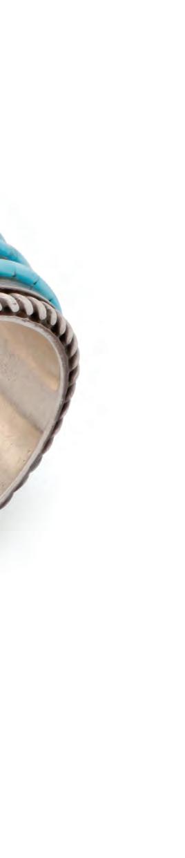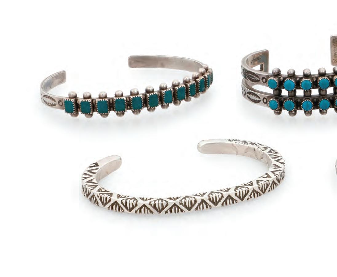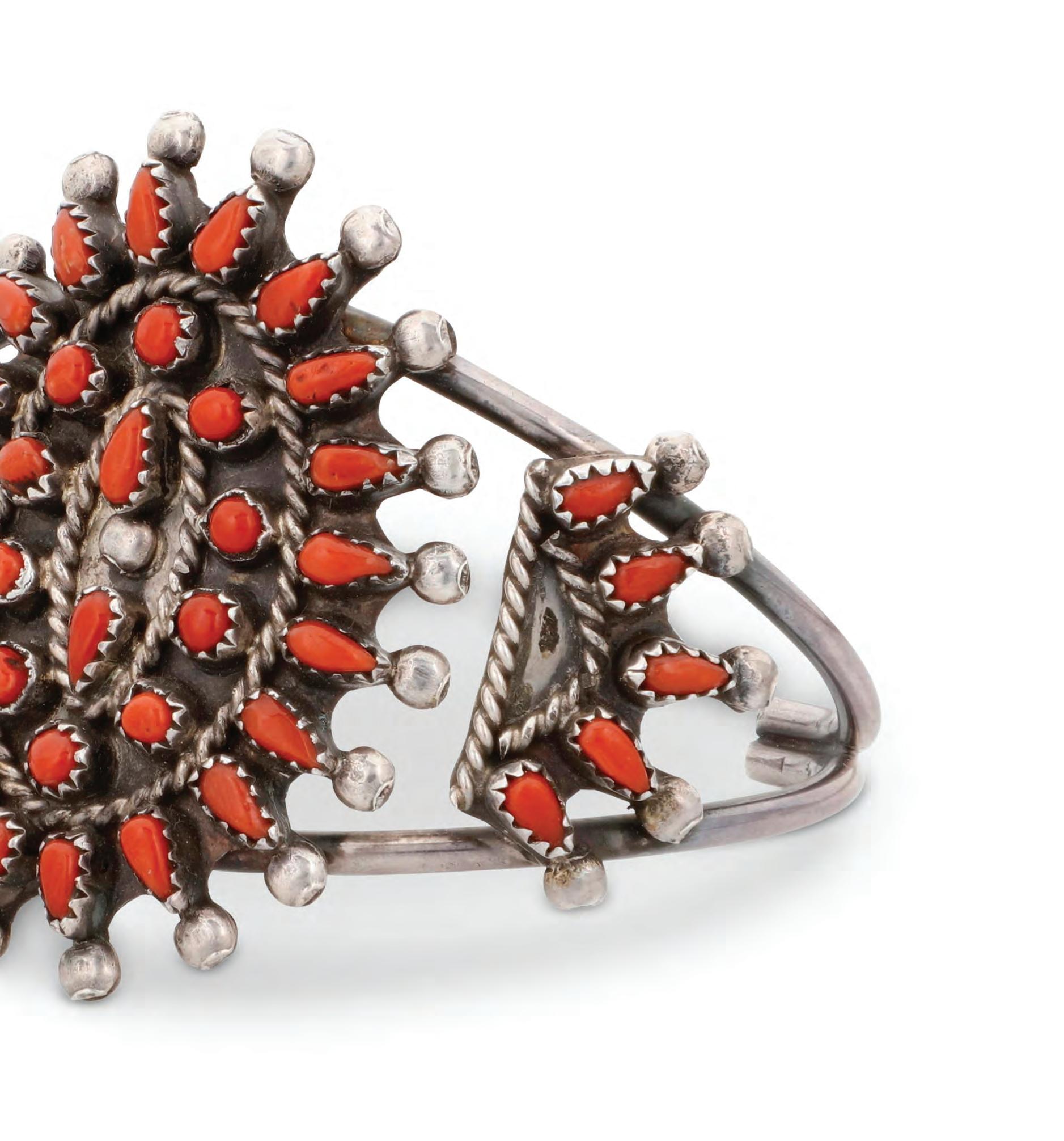 The cuff and each ring with a band of fine row-set needlepoint turquoise or coral and stamped motifs to edges