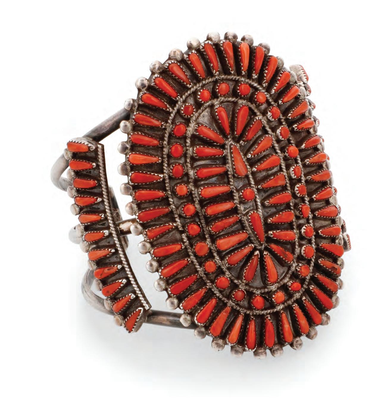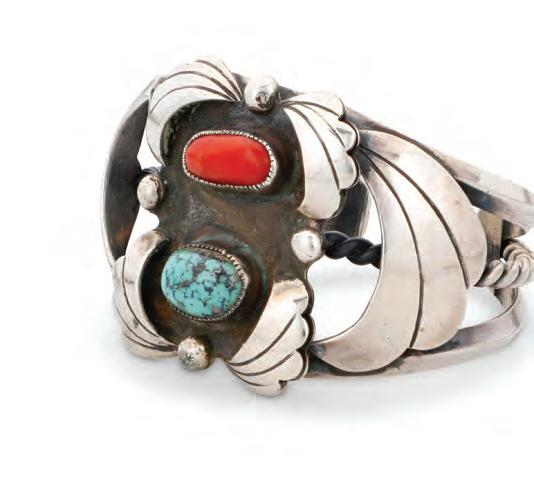 The cuff with curved plaques of needle point set coral and turquoise, together with a large sterling silver cluster set turquoise ring