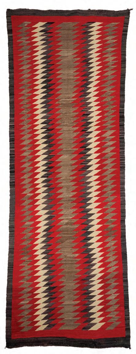 A large Navajo regional runner Early 20th century, Diné Woven in red, cream, natural grey, and dark brown wool, with alternating serrated vertical bands 124” L x 44” W