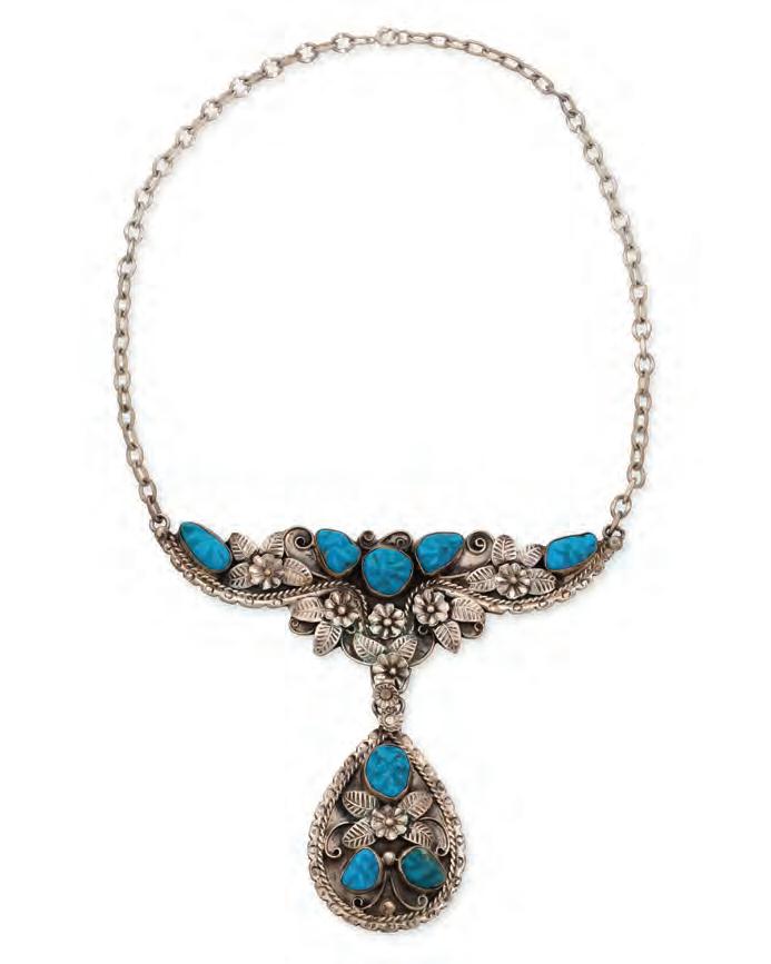 An ornate plaque necklace with carved set turquoise amidst elaborate silver overlay floral accents, suspending a teardrop silver and turquoise pendant