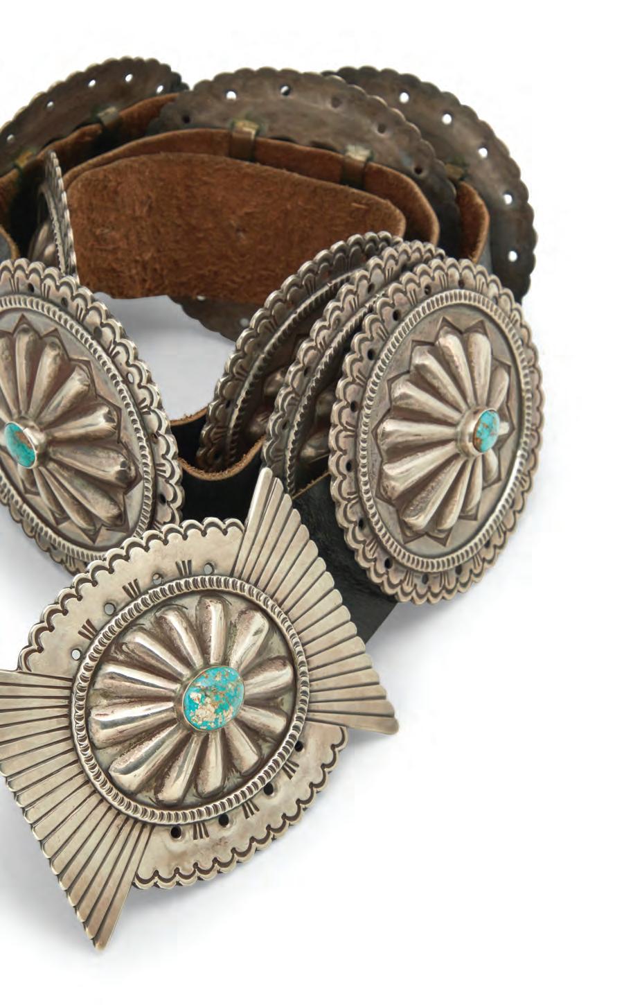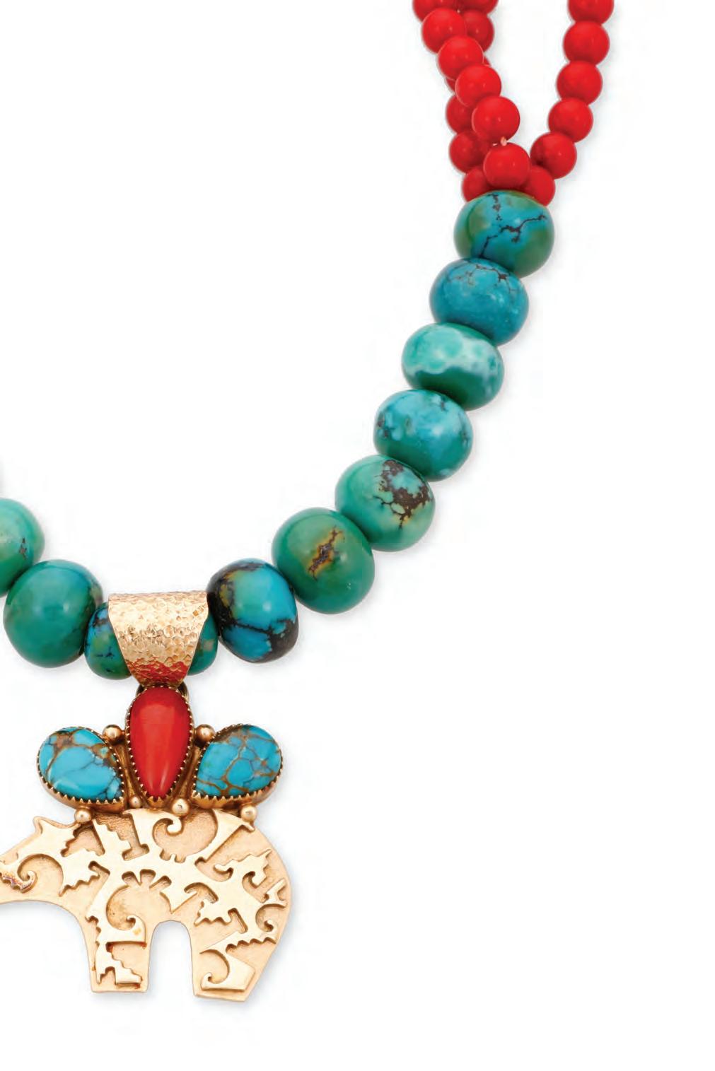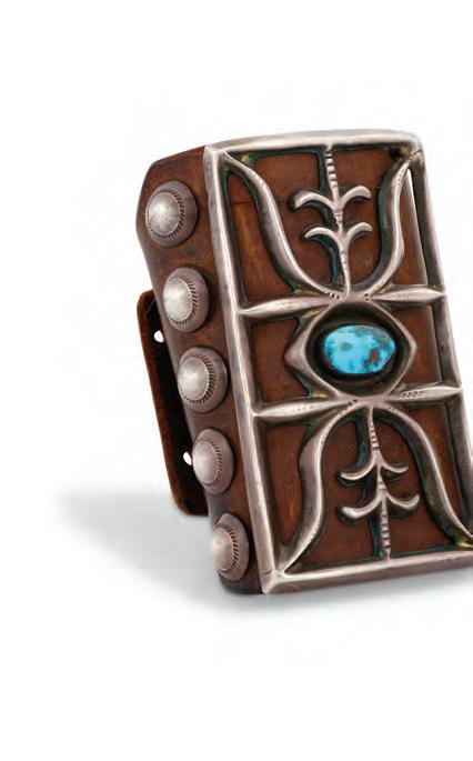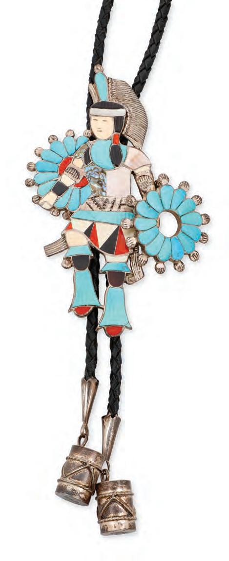 This artist is most known for his large kachina style bolo figures. This piece is more atypical but stands out for its detailed silver work and carved turquoise stones.