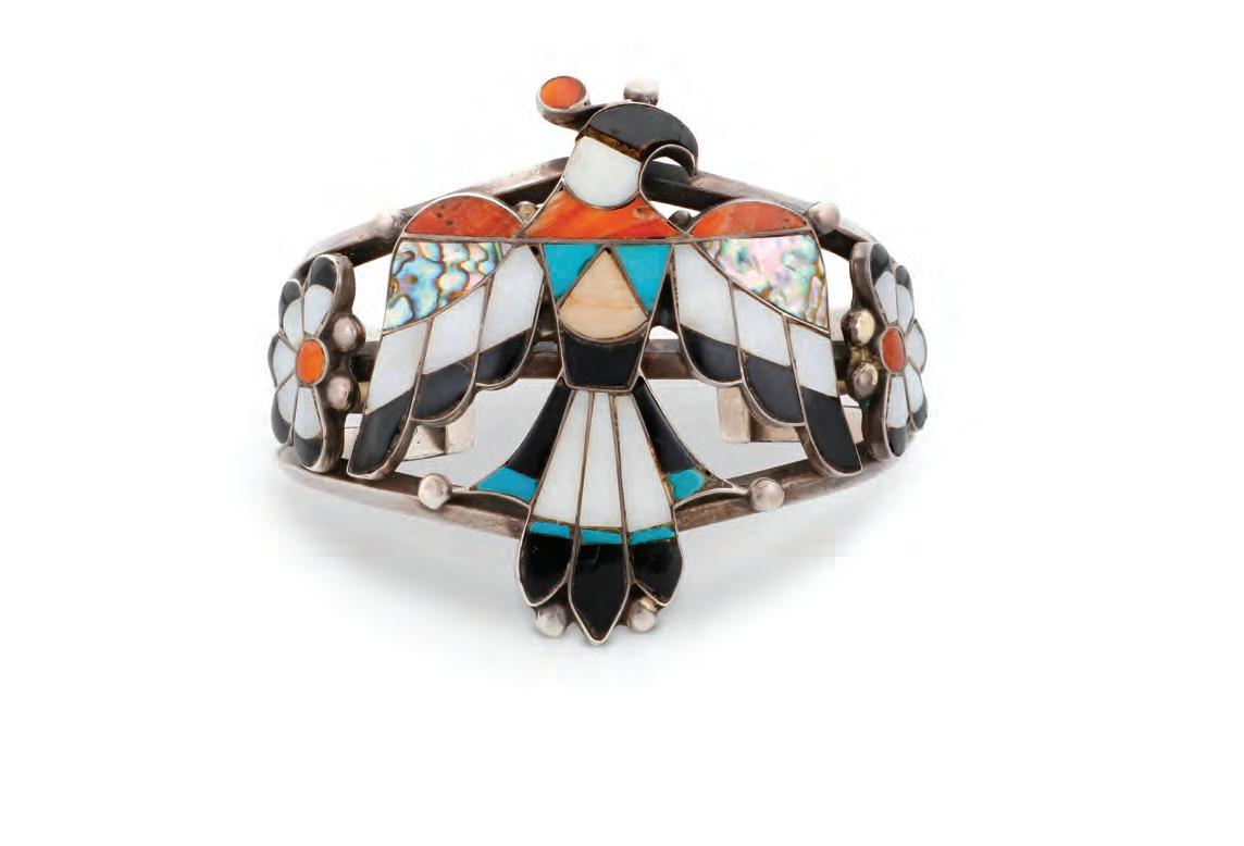 A chunky three-wire cuff with multistone inlay thunderbird motif including turquoise, coral, spiny oyster, mother of pearl, abalone, and onyx