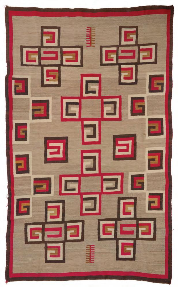 Woven in red, cream, grey, dark brown, and tan wool with a central Spider Woman cross within a stepped diamond, floating crosses to each corner, and a banded border