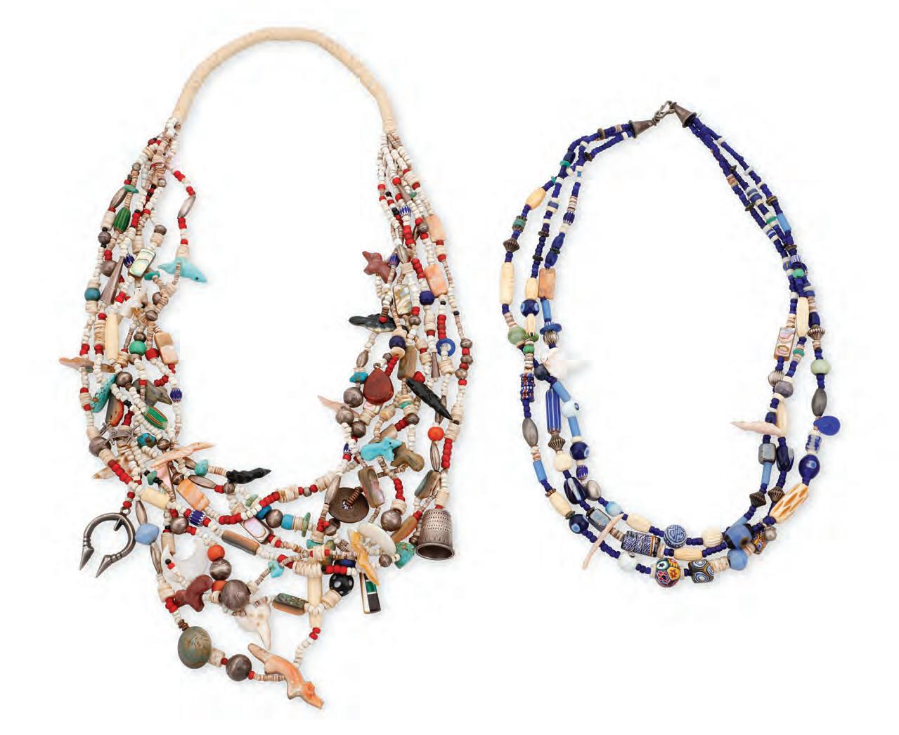 Comprising a seven-strand heishi necklace with found objects, fetish animals, a thimble, coins, a naja, silver beads, mother of pearl, and white heart trade beads, with a traditional wrapped neck cord (28” L), and a three-strand necklace in blue with African and Italian ceramic and glass trade beads and carved shell bird fetish beads (25” L)