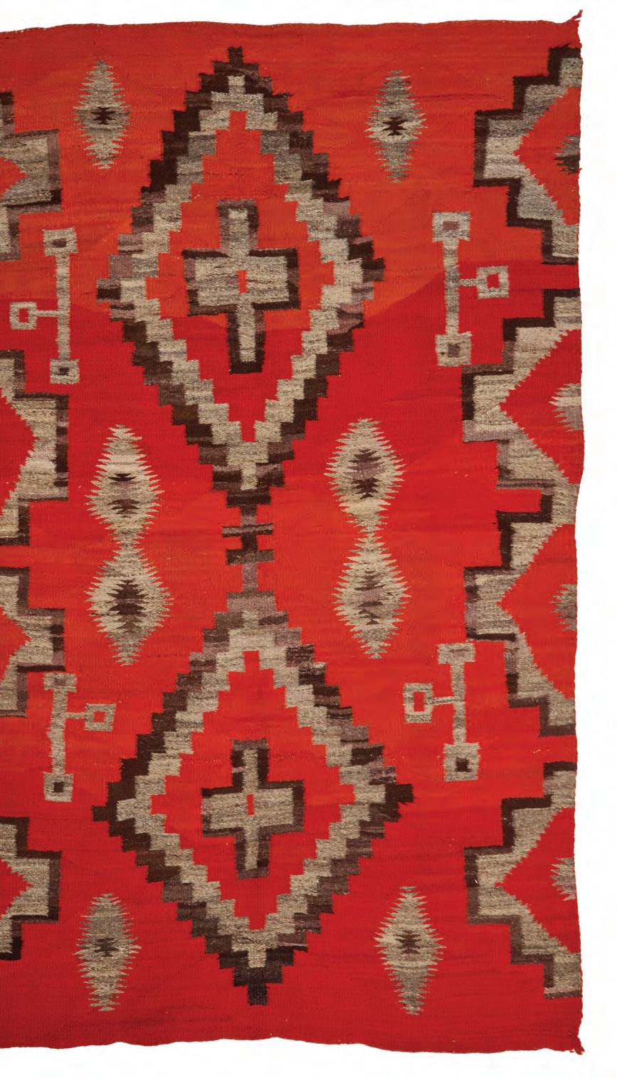 Early 20th century, Diné Woven in red, cream, ochre, dark brown, and natural grey/brown wool, with elaborate diamonds within a half X-form border