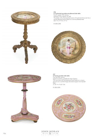 236 A Continental porcelain-set giltwood side table Fourth quarter 19th century Stamped: PLM; Signed: W. Sfofl The platter with a hand-painted scene of Cupid and Venus set into a carved giltwood frame raised on a carved pedestal base 30.5” H x 19” W x 19” D $1,000-2,000