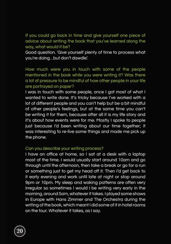 If you could go back in time and give yourself one piece of advice about writing the book that you’ve learned along the way, what would it be? Good question. ’Give yourself plenty of time to process what you’re doing…but don’t dawdle’. How much were you in touch with some of the people mentioned in the book while you were writing it? Was there a lot of pressure to be mindful of how other people in your life are portrayed on paper? I was in touch with some people, once I got most of what I wanted to write done. It’s tricky because I’ve worked with a lot of different people and you can’t help but be a bit mindful of other people’s feelings, but at the same time you can’t be writing it for them, because after all it is my life story and it’s about how events were for me. Mostly I spoke to people just because I’d been writing about our time together; it was interesting to re-live some things and made me pick up the phone. Can you describe your writing process? I have an office at home, so I sat at a desk with a laptop most of the time. I would usually start around 10am and go through until the afternoon, then take a break or go for a run or something just to get my head off it. Then I’d get back to it early evening and work until late at night or stop around 9pm or 10pm. My sleep and waking patterns are often very irregular so sometimes I would I be writing very early in the morning, around 5am, whatever it takes. I played some shows in Europe with Hans Zimmer and The Orchestra during the writing of the book, which meant I did some of it in hotel rooms on the tour. Whatever it takes, as I say.