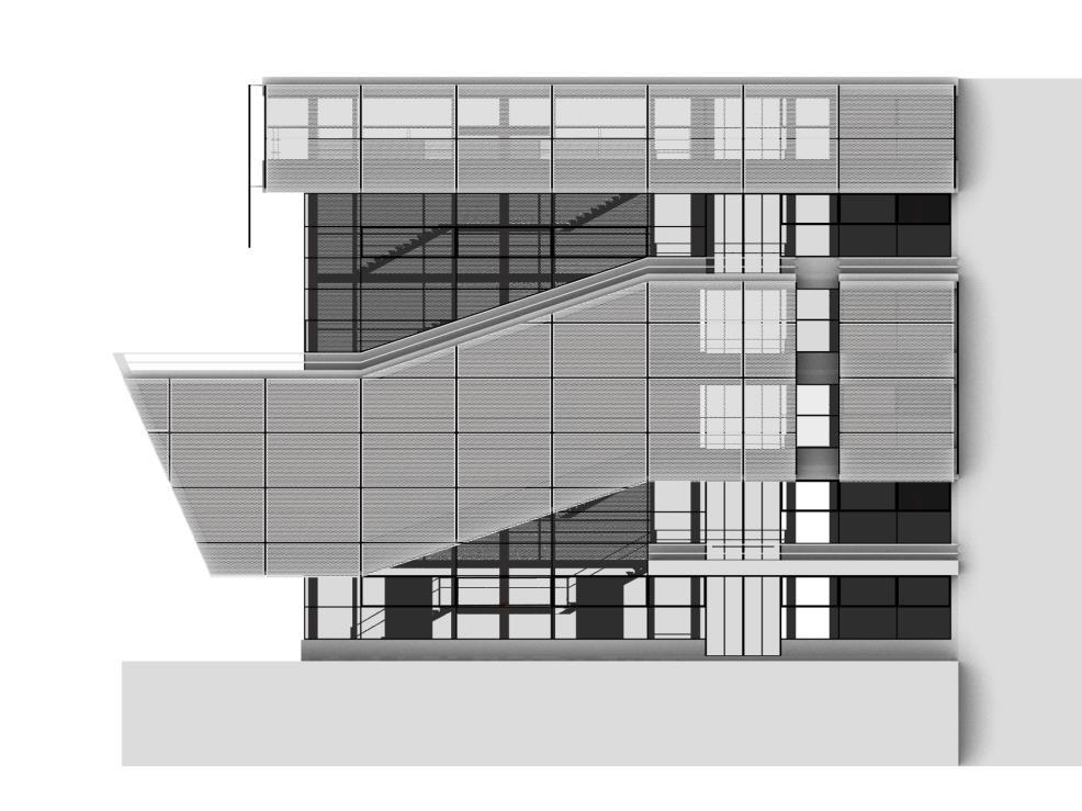 χώρο του αιθρίου-θεάτρου που εντάσσεται σε ένα σύστημα μιας ελαφριάς μεταλλικής κατασκευής που θα στεγάσει και τελικά το χώρο αυτό. το πιο σύνθετο και πολύπλοκο τμήμα της συνθετικής διαδικασίας, βέβαια καθώς αναλώθηκε πολύς χρόνος προκειμένου να καθοριστεί η τελική του μορφή στόχος και κριτήριο της ένταξης του στο υπόλοιπο θέμα είναι η δυναμική του παρουσία στο συνθετικό θέμα δίνοντας ταυτόχρονα τη δυνατότητα στέγασης ενός τμήματος του θεατρικού χώρου και δημιουργώντας ένα στέγαστρο για το δώμα του κτιριακού όγκου, δίνοντας την εντύπωση ότι ίπταται πάνω από το χώρο του αιθρίου-θεάτρου με κρίσιμη την αποφυγή της αίσθησης του εγκλεισμού.