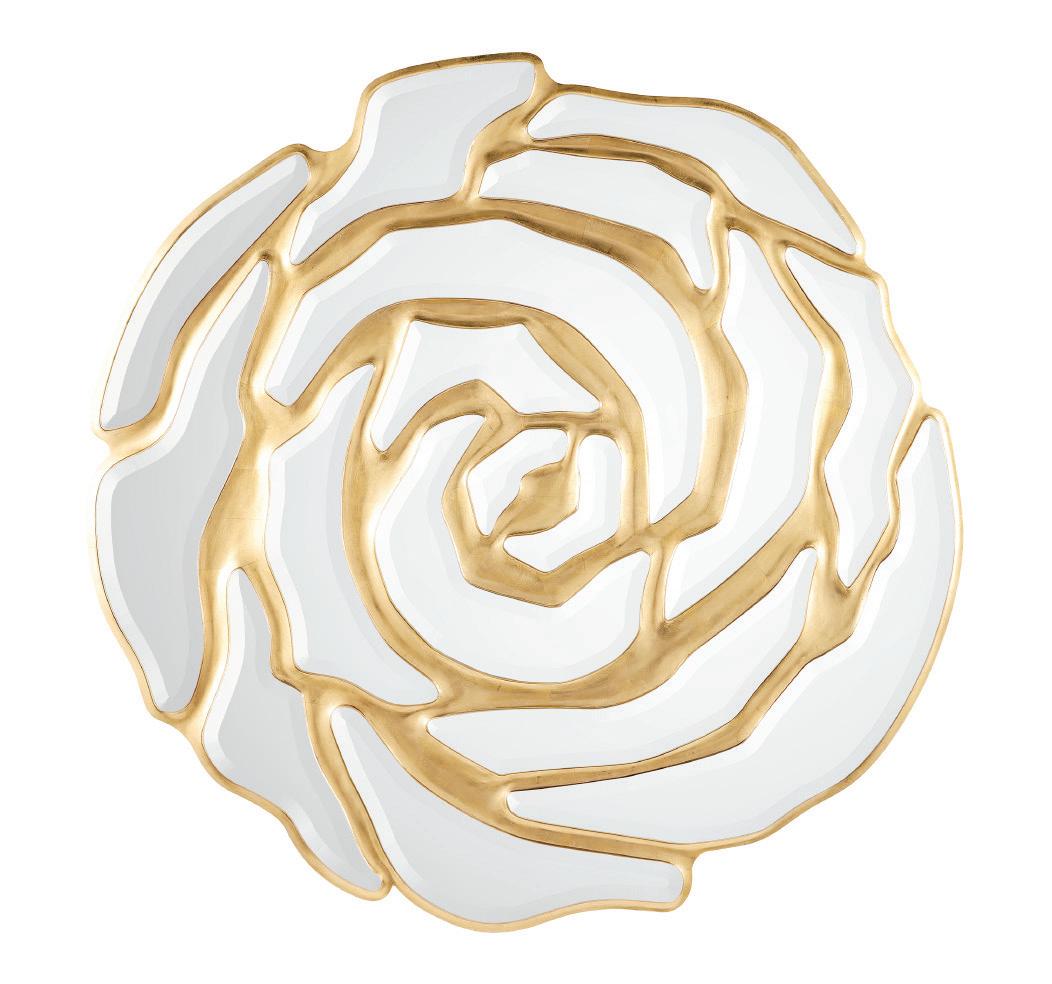 JRM-1514 (Genesi Mirror): The Genesi Mirror is defined by flowing contours of beveled glass, outlined in radiant Exotic Gold that accentuates its organic form The design captures a graceful sense of movement, its swirling pattern creating shifting reflections that animate the space around it. Mounted with French cleats, the mirror may rotate 360 degrees for a versatile and dramatic presentation 60” H x 60” W x 2” D
