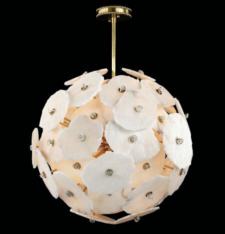 AJC-9513 (Montserrat Nine-Light Pendant): The Montserrat Nine-Light Pendant is a stunning blend of organic materials and contemporary style The piece is adorned in a layered cluster of alabaster stone affixed with brass accents, displaying rich textural forms that create a bold dimensional statement. Light bulbs are not included with purchase. 59” H x 31” W x 31” D