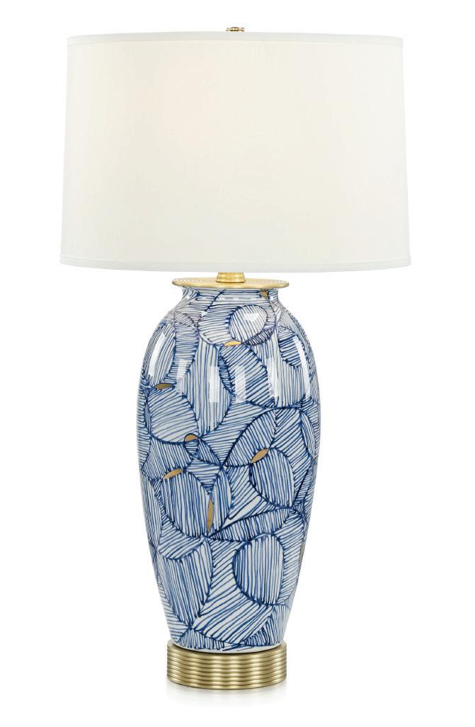 JRL-11366 (Kanasari Table Lamp): The Kanasari Table Lamp is crafted from glazed porcelain, featuring a rounded profile adorned with abstract blue shapes that create a layered visual effect. Reflective gold accents intermingle with the hand-painted patterns, adding depth and a subtle touch of radiance. The lamp rests on a grooved Brushed Brass base, topped with an off-white silk drum shade with rolled edges and a matching brass peg finial. 27” H x 17” W x 17” D