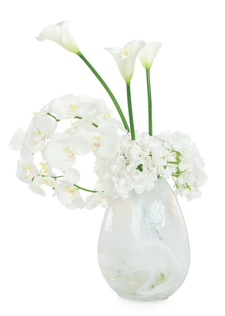 JRB-5661W (Snow White Breeze): Snow White Breeze presents white hydrangeas, calla lilies, and a phalaenopsis spray, beautifully arranged in a white glass vase with faux water. 30” H x 21” W x 19” D