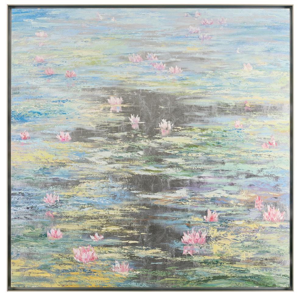 JRO-3582 (Teng Fei’s Floating in Silence I): Floating in Silence by artist Teng Fei is a serene oil painting on canvas in which pink florals gracefully drift across a still body of water. Painted over a hand-finished silver-leaf backdrop, the piece displays a subtle radiance that elevates the look. This artwork is held within a wooden floater frame in Champagne Silver, meant for vertical display only. 60” W x 60” H x 2.5” D